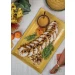 Servido inteiro, com o molho da marinada à parte, e decorado com nozes, tâmaras e damasco.